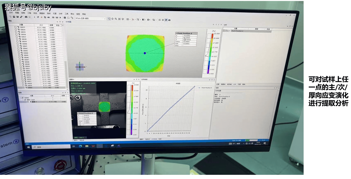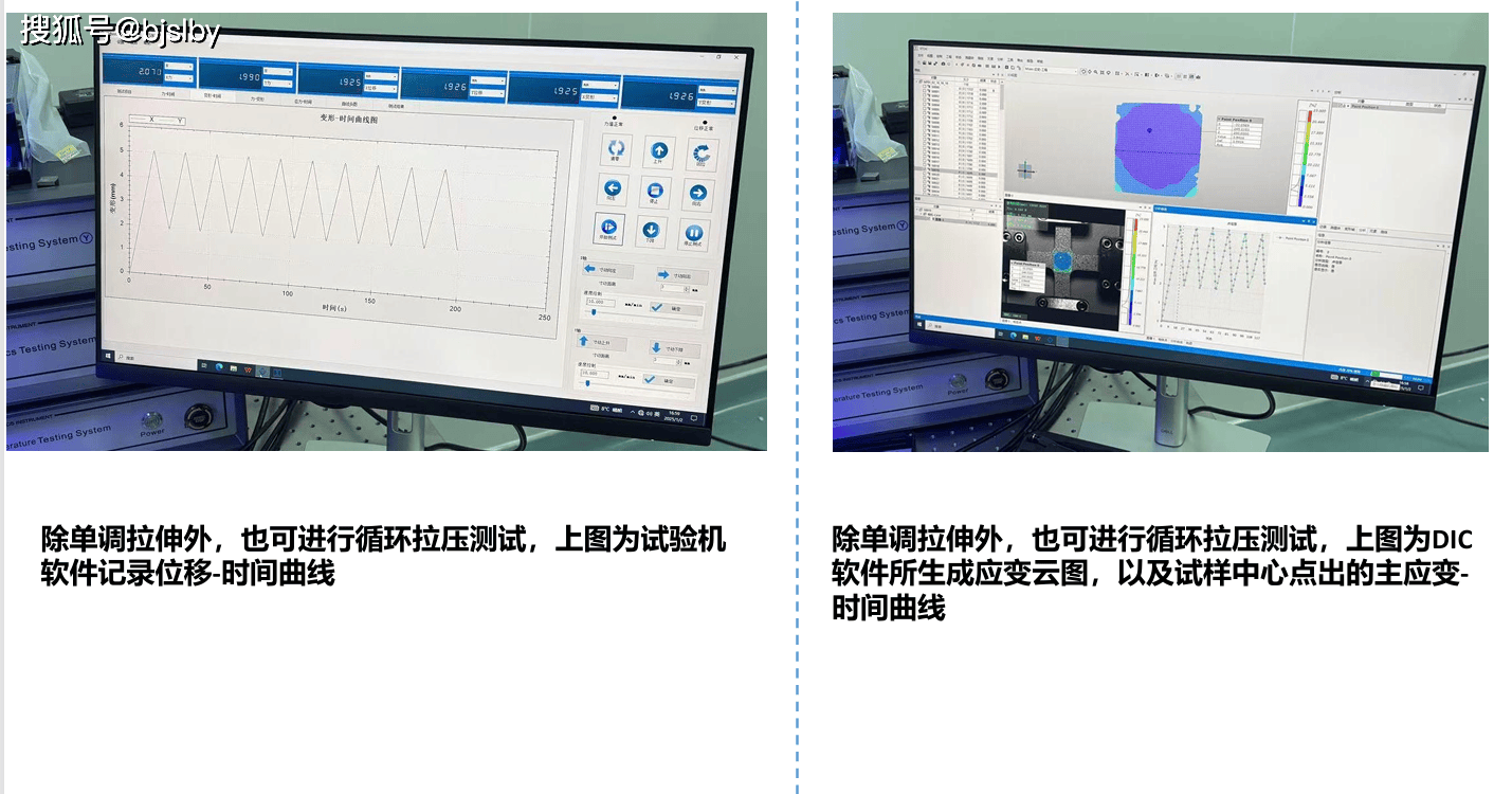 3. 的非接触场应变测量(DIC&视频引伸计) 这是该系统的一大亮点,其集成的DIC&视频引伸计具备以下卓越特性: * 高精度与高分辨率: 位移分辨力高达0.2μm,精度达±1μm,满足从微小变形到大变形的测量需求。 * 场与多点测量: 不仅能像传统引伸计一样测量特定“标距”内的平均应变,更能提供场应变云图(如PDF中展示的DIC云图),并允许用户任意提取试样上任何一点的主、次、厚向应变演化曲线。 * 超凡的适应性: * 非接触: 避免了对软质、微小或在高低温环境下试样的接触干扰。 * 大变形测量: 应变测量范围从0.002%至超过1000%,远超传统方法。 * 恶劣环境适用: 可适配高低温箱、水浴等环境附件,进行特殊条件下的测试。 * 智能高效的软件: 软件支持自动标定、自由设定标距、多线程实时计算、数据降噪、多种数据导出格式(如Excel)以及丰富的曲线分析功能,大提升了测试与分析效率。 4. 高度的灵活性与可扩展性