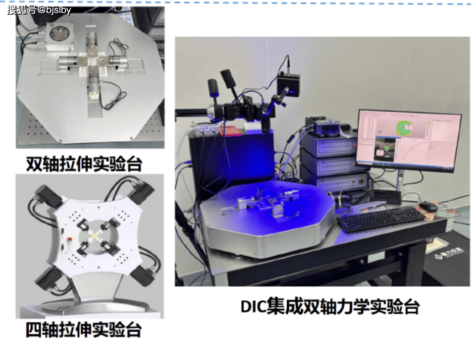 该系统原位双轴力学实验系统,可按需定制,即可进行单轴力学测试,也可 进行双轴/四轴比例、非比例加载测试,加载模式包括定位移速度和定载荷速度, 可搭配DIC、视频引伸计等测量技术,测试材料在复杂加载下的力学性能、 分析应变演化。 集成了精密机械、自动控制、数字图像相关法(DIC)与视频引伸计的高端材料力学测试平台。其核心由双轴试验机、多功能控制器、控制分析软件以及DIC&视频引伸计测量系统组成,旨在实现对材料在复杂载荷下的力学行为进行精准、多维度的原位分析。