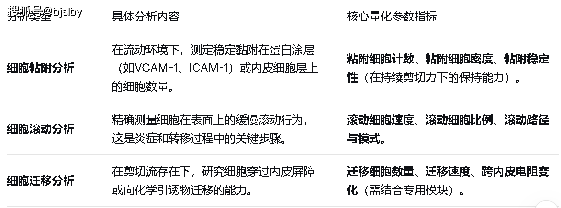 3. 核心参数 剪切应力范围:0.05 - 100+ dyne/cm?,覆盖静脉到小动脉的生理范围及病理高剪切力。 通道尺寸:多种规格(如宽度从150?m到>1000?m),适合不同实验规模。 通量:支持多通道并行实验,可实现96孔板规格的高通量筛选。 成像与分析:自动多点位成像,软件可分析细胞速度、位移、加速度、滚动频率、粘附强度等上百个参数。 细胞兼容性:可用于中性粒细胞、淋巴细胞、血小板、循环肿瘤细胞、干细胞等几乎所有悬浮细胞。
