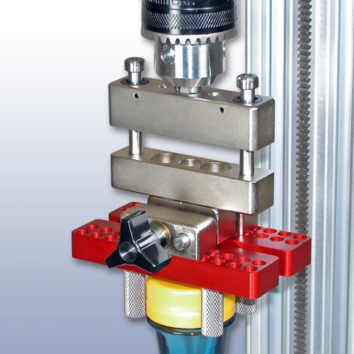Designed to compensate for axial movement in torque tests of threaded fasteners, bottle caps, etc. The axial compensator has a hex tail which fits into the chuck of a Series STJ or MGT torque gauge, and includes mounting hardware to mount to a G1053 or G1058 grip.