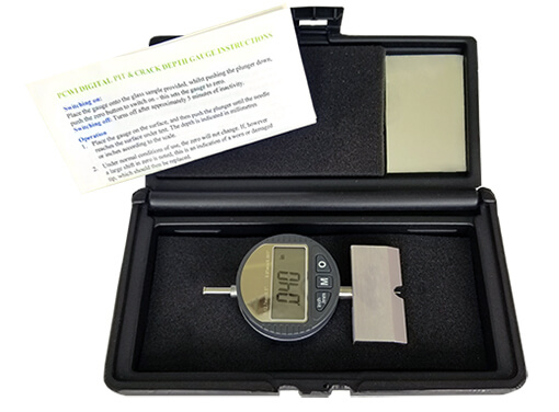 The PCWI Pit & Crack Depth Gauge Kit includes gauge, carrying case, glass mirror sample, mini allen wrench, spare battery and instructions.