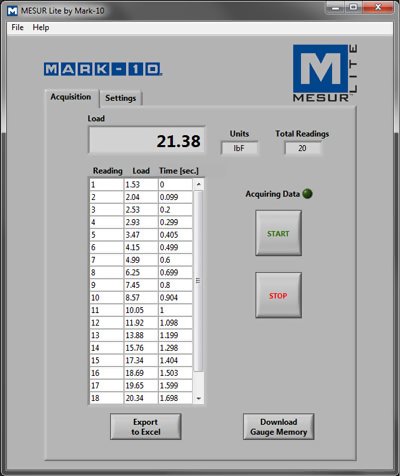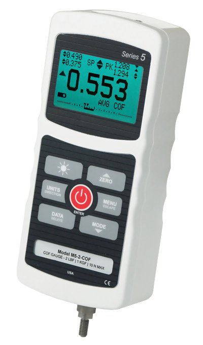 The Mark-10 M5-2-COF Coefficient of Friction Gauge is an integral part of a COF testing system, typically including a motorized test stand and COF fixture. With a capacity of 2 lbF [10 N], the gauge can be used to measure friction for a wide range of materials, ideal for conformance to ASTM D1894 and other relevant standards. Static and kinetic coefficients are displayed on the backlit LCD, and are calculated from a user-programmable sled weight. Data can be transferred to a PC or data collectors via USB, RS-232, Mitutoyo (Digimatic), or analog outputs. On-board memory for up to 1,000 readings is included, as are statistical calculations with output to a PC. Integrated set points with indicators and outputs are ideal for pass-fail testing and for triggering external devices such as an alarm, relay, or test stand. Configurable password protects against unauthorized changes to settings. The Mark-10 M5-2-COF Coefficient of Friction Gauge may also be used for a number of common tension and compression testing applications. The Mark-10 M5-2-COF Coefficient of Friction Gauge includes MESURTM Lite data acquisition software. MESURTM Lite tabulates continuous or single point data. Data saved in the gauge's memory can also be downloaded in bulk. One-click export to Excel easily allows for further data manipulation.
