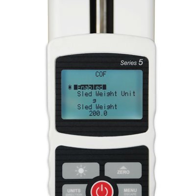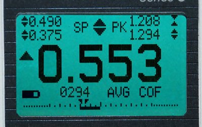 Set points: Three open drain lines. | | Configurable Settings | COF sled weight, digital filters, outputs, automatic output (via USB/RS-232), automatic shutoff, default settings, averaging mode, external trigger, passwords, key tones, audio alarms, backlight, calibration | | Safe overload | 150% of full scale (display shows "OVER" at 110% and above) | | Weight | 1.0 lb [0.45 kg] | | Warranty | 3 years |