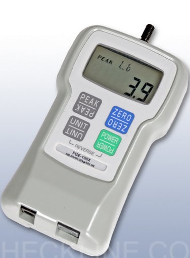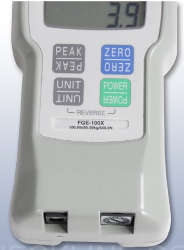 Simple one button adjustment changes units of measure, while pressing the peak button quickly produces the highest recorded value during the test. The 180° reversible display combined with the adjustable force direction and dual labeled keypad enable the FGE-XY to excel in both compression and tension applications in any direction. Models are available from 0.5 lbs to 100 lb ranges providing a large offering for various testing requirements.