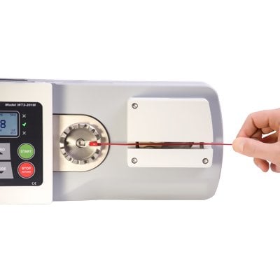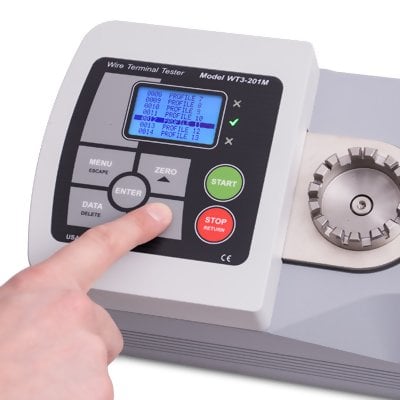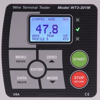 The WT3-201M motorized wire pull tester measures pull-off forces of up to 200 lb / 100 kg on crimped terminals. The WT3-200M tests according to UL, ISO, ASTM, SAE, MIL, and other testing standards. The WT3-200M can perform destructive or optionally Non-destructive testing, such as pulling to a load or maintaining a load for a specified period of time, as per the requirements of UL 486A/B. Programmable pass/fail limits with red and green indicators and audio alerts help identify non-conforming samples.