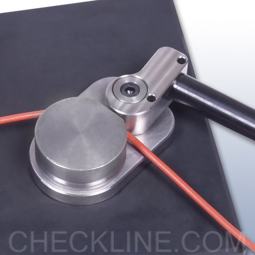 Calibration for all WTT-110 models can easily be verified or re-certified with a single 50 Kg hook weight as described below:1. Remove the lever by unscrewing it in a counter-clockwise direction and move the Wire Clamp assembly out from the path of the hanging sample. 2. Position the WTT-110 in a vertical position at the edge of a strong bench or desk (refer to photo). Be sure to secure it so it can not topple over when the weight is attached. 3. Using a heavy-duty monofilament (fishing line), wire or similar, suspend a known weight from one of the teeth on the wire terminal fixture by hooking a loop of the material over the selected tooth. Complete calibration instructions: Checkline WTT-110 Calibration Manual - Click here to download |
