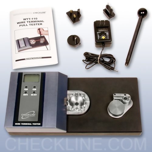 WTT-110 Wire Terminal Tester - Pull Tester | Measuring Range 0-50 Kg / 0-110lbs / 0-500 N (User Selected)Accurately measure the pull or “pull-off” force on most soldered or solder-less wire terminals, crimped connectors and similar wire terminations. The WTT-110 is an easy to use all-in-one, single-range solution suitable for a vast majority of terminal testing applications eliminating the need to purchase any additional grips, fixtures or accessories. Suitable for wires AWG 30 to AWG 8 (diameters from 0.010" to 0.130"). Pricing WTT-110: $1,995.00 WTT-110RS: $2,095.00 |
