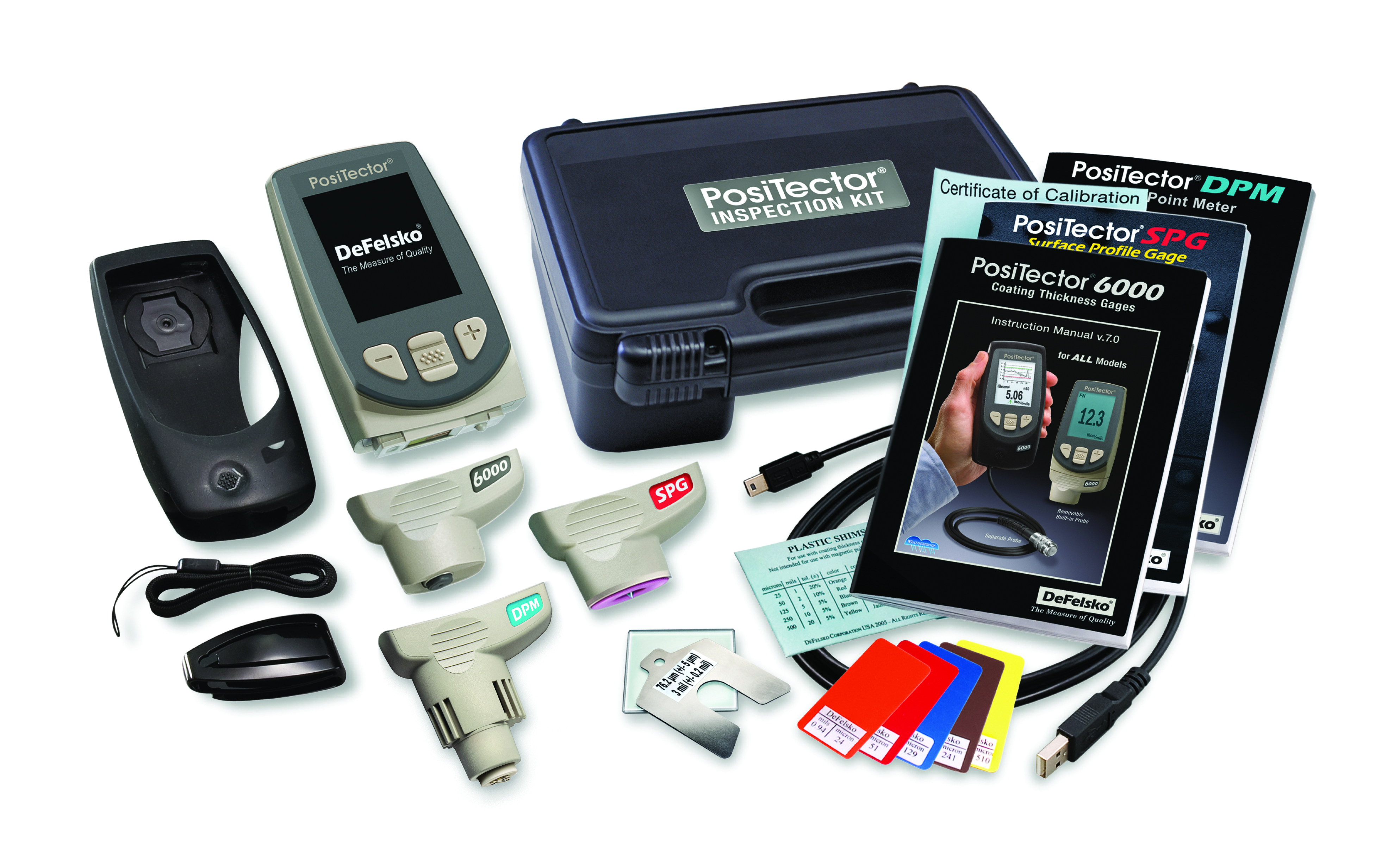 PosiTector Inspection Kits contain a PosiTector gage body (Standard or Advanced) and 3 probes – coating thickness (Ferrous Only or Combination Ferrous Non-Ferrous), environmental dew point and surface profile, as well as accessories in a convenient hard shell carrying case. Available with your choice of Standard or Advanced Gage features (see Feature Comparison Chart). Each PosiTector body accepts the PosiTector 6000, DPM, and SPG probes included in the kit easily converting from a coating thickness gauge to a dew point meter or surface profile gauge. Select from 8 pre-configured kits or build your own, contact us for details. Kits come complete with a gauge body (Standard or Advanced), coating thickness probe (Ferrous Only or Combination Ferrous Non-Ferrous), environmental probe, surface profile probe, precision plastic shims, glass zero plate and metal shim, protective rubber holster with belt clip, wrist strap, 3 AAA alkaline batteries, 3 instruction manuals, hard shell case, protective lens shield, 3 Long Form Certificates of Calibration traceable to NIST, USB cable and 2 year warranty on gauge body and probes. Case Size: 12 x 10 x 4 Inches / 30 x 25 x 10 cm