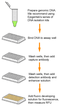 The MethylFlash™ Hydroxymethylated DNA Quantification Kit (Fluorometric) contains all reagents necessary for the fluorometric quantification of global DNA hydroxymethylation. In this assay DNA is bound to strip wells that are specifically treated to have a high DNA affinity. The hydroxymethylated fraction of DNA is detected using capture and detection antibodies and then quantified fluorometrically by reading the RFU (relative fluorescence units) in a fluorescence microplate spectrophotometer at excitation 530 +/-20 nm and emission 580 +/-20 nm. The amount of hydroxymethylated DNA is proportional to the fluorescence intensity measured which can be calculated with the kit's included formulas for relative hydroxymethylation status of two different DNA samples or absolute quantification of 5-hydroxymethylcytosine (5-hmC) using a standard curve.